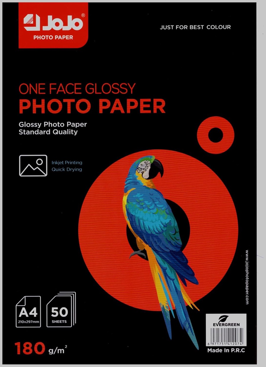 ورق جلوسي جوجو هو ورق صور لامع، مقاوم للماء، وعالي الجودة، مصمم خصيصًا للطابعات النافثة للحبر لإنتاج مطبوعات ذات ألوان زاهية وحادة. يتميز بوزن ثقيل نسبيًا يمنحه ملمسًا متينًا وفاخرًا، وقدرة على التجفيف السريع لتقليل التلطخ.