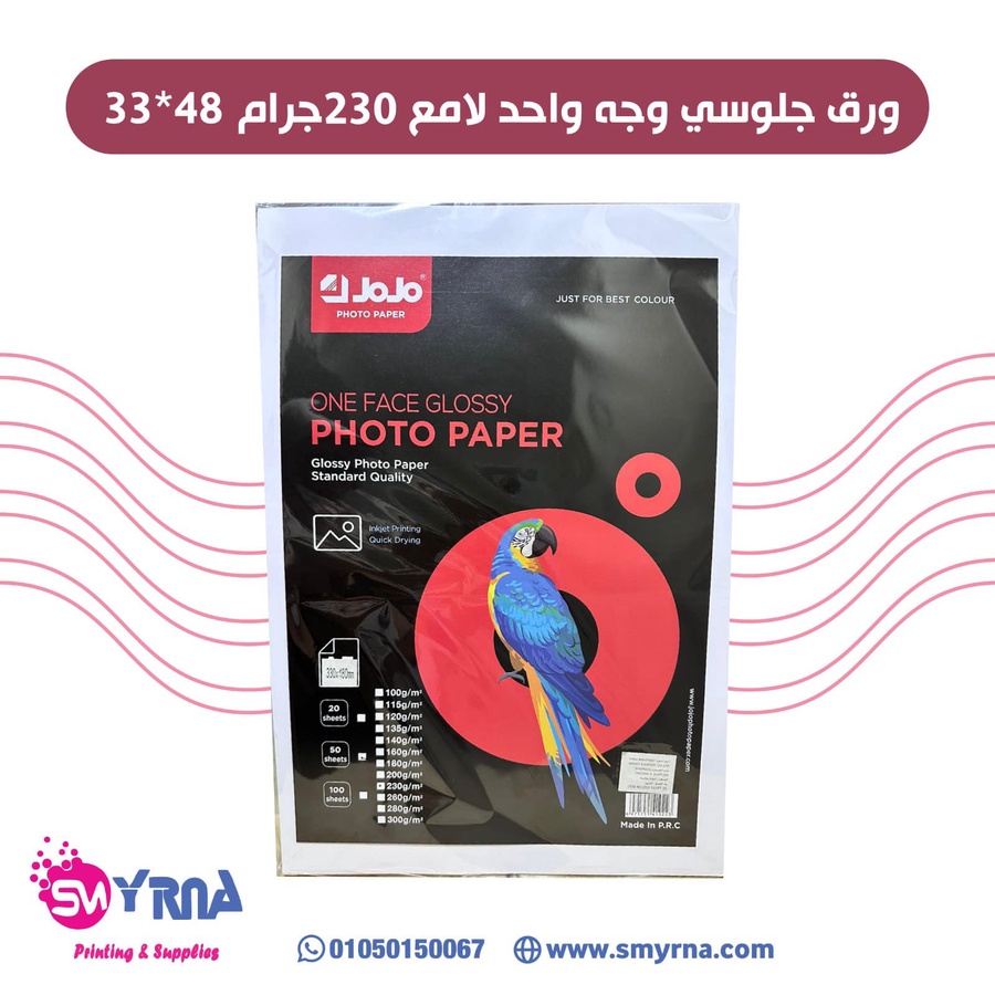 ورق جلوسي جوجو هو ورق صور لامع، مقاوم للماء، وعالي الجودة، مصمم خصيصًا للطابعات النافثة للحبر لإنتاج مطبوعات ذات ألوان زاهية وحادة. يتميز بوزن ثقيل نسبيًا يمنحه ملمسًا متينًا وفاخرًا، وقدرة على التجفيف السريع لتقليل التلطخ.