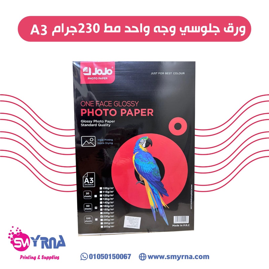 ورق جلوسي جوجو هو ورق صور لامع، مقاوم للماء، وعالي الجودة، مصمم خصيصًا للطابعات النافثة للحبر لإنتاج مطبوعات ذات ألوان زاهية وحادة. يتميز بوزن ثقيل نسبيًا يمنحه ملمسًا متينًا وفاخرًا، وقدرة على التجفيف السريع لتقليل التلطخ.